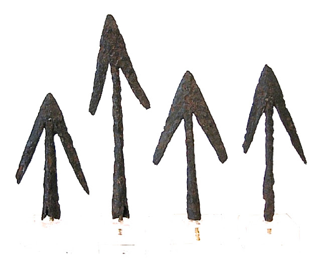 1400-1499 CE, In excavated condition, including a number of swallow tail form; one with a near pyramidal tip and tapering tang; another for stunning game; and seven with small pyramidal tips with tapering tangs. The group also includes several of the important military type 16 form.